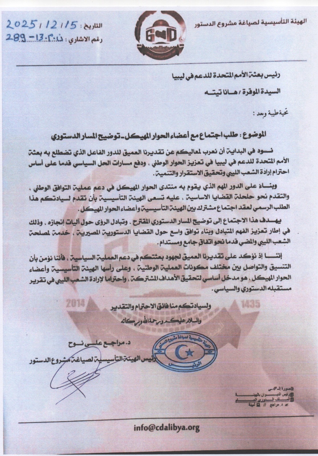 في خطوة تهدف إلى تسريع العملية السياسية وإنهاء حالة الجمود الدستوري، وجّهت الهيئة التأسيسية لصياغة مشروع الدستور طلباً رسمياً إلى بعثة الأمم المتحدة للدعم في ليبيا، دعت فيه إلى عقد اجتماع موسع مع أعضاء منتدى الحوار المهيكل.
