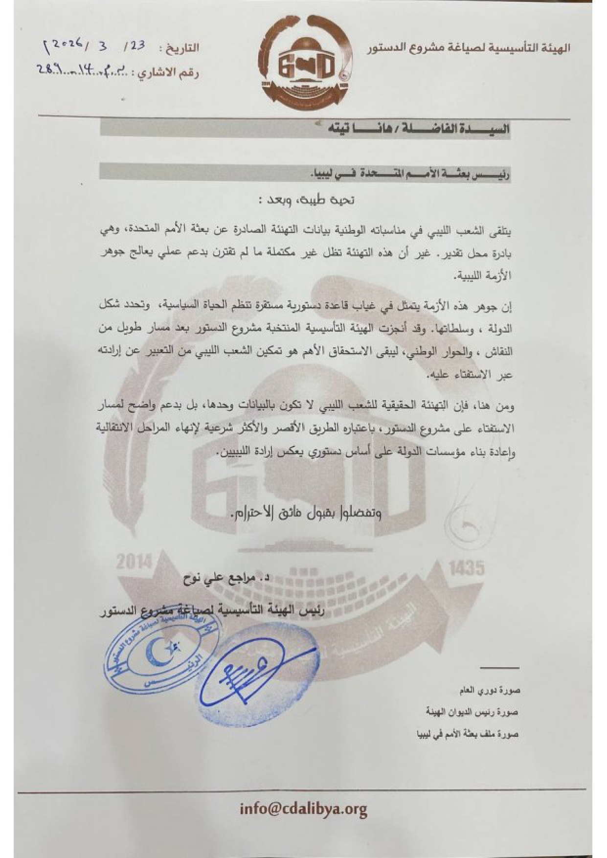 في خطوة تدعو بعثة الأمم المتحدة إلى الوقوف بجانب مشروع الدستور الليبي، وجه رئيس الهيئة التأسيسية لصياغة مشروع الدستور خطاباً إلى بعثة الأمم المتحدة في ليبيا، دعا فيه البعثة إلى الاضطلاع بدور حقيقي ومسؤول يدعم المسار الدستوري في البلاد.